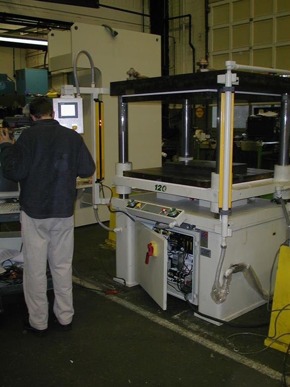 | Appl: | Compression Molding | All Greenerd Presses are designed and built to ANSI B-11.2 1995 (R-2010) compliance. SPECIFICATIONS FOR a Used 4-POST HYDRAULIC PRESS · Model Number........................................................................................ 4U-120-42 X 40-25R3 · Force................................................................................................... Adjustable 24 to 120 tons · Work Area: Left to Right between posts.............................................................................. 42” · Work Area: Front to Back overall......................................................................................... 40” · Overall width, left to right..................................................................................................... 60” · Overall height ............................................................................................... Approximately 84” · Clearance between columns front to back............................................................................. 30” · Daylight = Maximum Open Distance.................................................................................... 24” Note: “Shut Height” = Daylight Less Maximum Stroke · Stroke............................................................................................. Adjustable to maximum 24” · Cylinder Bore Diameters (2 cylinders provided)..................................................................... 8” · Ram Diameters...................................................................................................................... 5.5” · Bed to floor height................................................................................................................. 41” · Motor Capacity.............................................................................................. 10 HP, 1800 RPM · Pump capacity......................................................................................................... 25 & 3 GPM · Hydraulic System................................................................................................... Regenerative · Reservoir Capacity..................................................................................... 95 Gallons Minimum · Maximum System Pressure........................................................................................... 2388 PSI · Ram Speed: Close, inches per minute in run (or auto) mode............................................. 145 Press, inches per minute in run (or auto) mode................................................ 10 Open, inches per minute in run (or auto) mode............................................. 130 4-POST FEATURES Hydraulic Cylinder: Conforms to NFPA and ANSI B93.15-1981 standards. Head: Steel plate, flat and parallel. Bed: Steel plate, flat and parallel. Moving Platen: Steel plate, flat and parallel. Columns: Four (4) columns, shouldered and piloted to hold close tolerance. Bearings: Moving platen guided by self-lubricating, graphite impregnated bronze bearings. Location of Hydraulic Power Unit: Mounted on floor adjacent to press. Pump: High performance balanced vane pumps for quiet, smooth, long lasting operation. Filter: A 10-micron return line filter with replaceable element. Oil Reservoir: A large clean out plate permits easy maintenance. Fluid Level Sight Gauge, tank filler/breather cap with safety strainer included. Pressure Gauge: Built in surge protection and needle valve shut off to prolong gauge life Emergency Stop. Pull to start/Push for all stop button; no ram motion during restarts. Dual Hand controls. Anti-tie down and non-repeat dual palm button controls are protected by ring guards. Ensures safe operation and OSHA code compliance. Keyed Selector Switch: Supervisory control of mode selection creates no press motion. Run Mode: Both buttons must be depressed simultaneously (within .5 seconds) and held down concurrently to advance ram. Release of either or both buttons causes ram to stop. Jog (Inch) Modes: Depress dual palm buttons to advance ram. When one or both buttons are released ram stops and hold position. Further jogging action on buttons “inches” ram. Stroke Controls: Ram stroke settings controlled by adjustable proximity sensors. Pressure control: Adjustable relief valve with pressure reversal (flow) switch. Programmable Logic Controller: Control is easily programmed for additional features. Motor Type: Open Drip-proof “C” face type flanged directly to the pump. Main Control Cabinet: NEMA 12 Enclosure includes a combination starter with fusible disconnect and built-in transformer for step-down to 110 volts control circuit. Conforms to OSHA and eliminates extra wiring for separate control circuit. Electrics arranged for 460 Volt, 3 Phase, 60 Cycle operation. Other voltages are available at an additional cost. Included EQUIPMENT · Distance Reversal to set depth of ram stroke for automatic return up. · Pressure Reversal to set pressure at which ram returns up automatically. · Pre-Slow Down Circuit to set height for changeover from rapid advance speed to pressing speed. · Water-Cooled Heat Exchanger: Water-cooled hydraulic oil cooler to maintain hydraulic oil at optimum operation temperature (about 120oF). For use under conditions of continuous high production, pressure dwells, and/or ambient temperatures. · 6” Color Electronic Press Control: A powerful, compact control for digital control over press functions. Simple, user-friendly system, with keypad or touch screen entry of control functions and set-up parameters. Closed Loop Pressure Control compensates for temperature variation and allows repeatable accuracy of ± 5%. Option includes the operator interface and enclosure, fixed pendant mounting to the head of the press, linear transducer, pressure transducer, extra PLC capacity, and an electronic relief valve. · Set Digital Top Stop, Slow Down, and