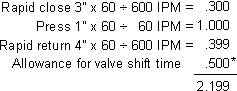The number of strokes per minute for a hydraulic press is determined by calculating a separate time for each phase of the ram stroke. The rapid advance time is calculated, then the pressing time, (the work stroke); then, if there is no dwell time, the rapid return.